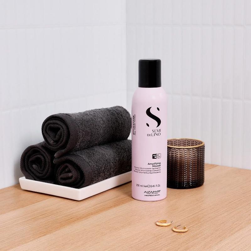 La mousse voluminizadora Alfaparf Milano Semi di Lino Amplifying Mousse realza el volumen natural y el grosor de la fibra capilar, dejando el cabello ligero, brillante y con cuerpo.