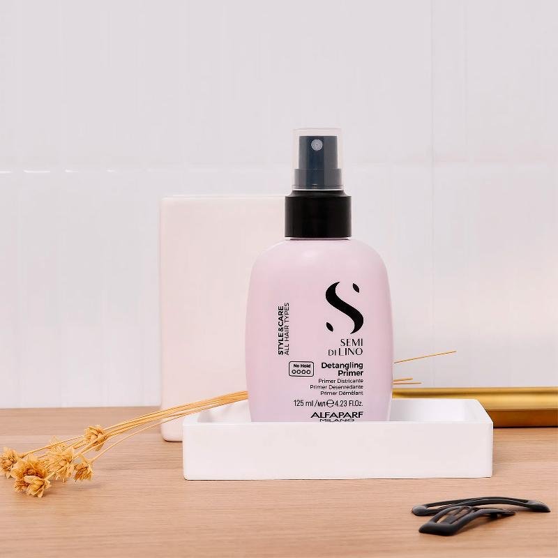 El spray previo al peinado Alfaparf Milano Semi di Lino Detangling Primer facilita el desenredo, condiciona y controla el frizz, haciendo que el secado sea más rápido y eficiente.