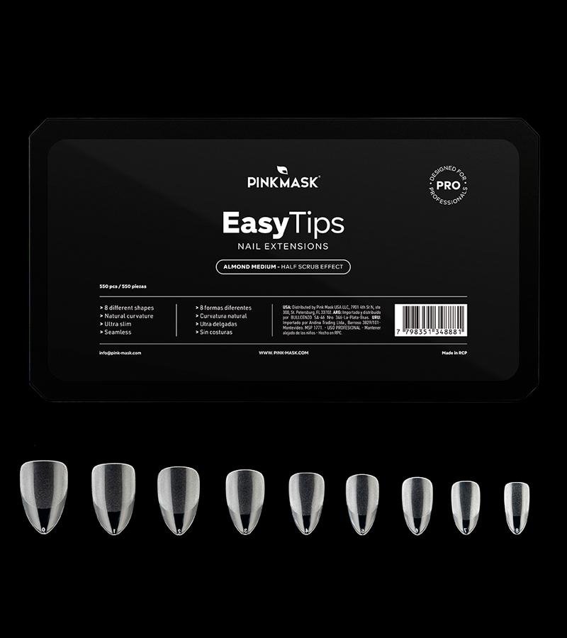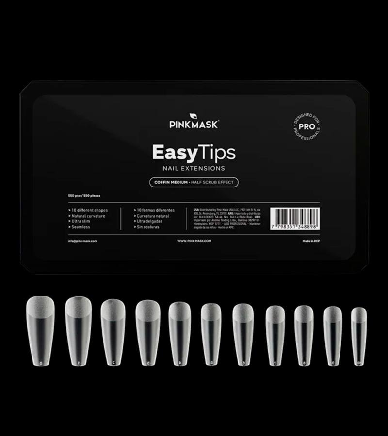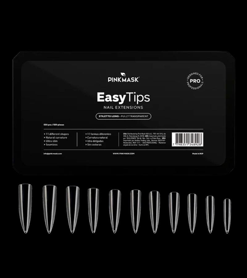 Presentación disponible en caja de 550 piezas con 11 tamaños diferentes, del 0 al 10. Curvatura natural, ultra delgadas para lograr un óptimo ajuste sobre las uñas.