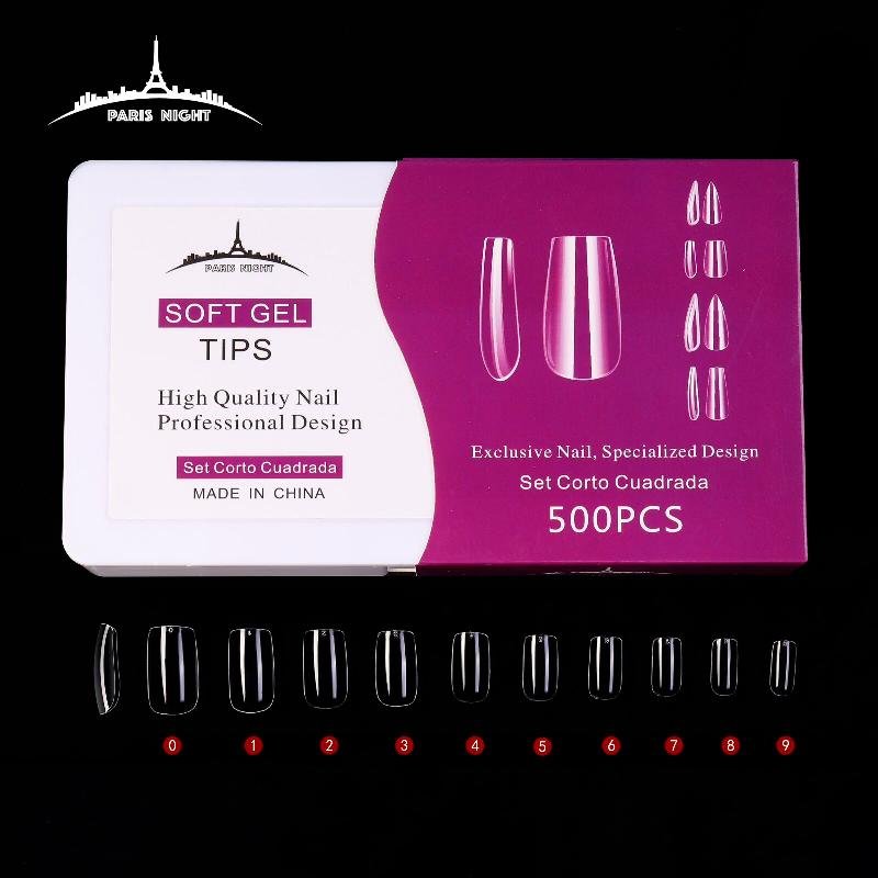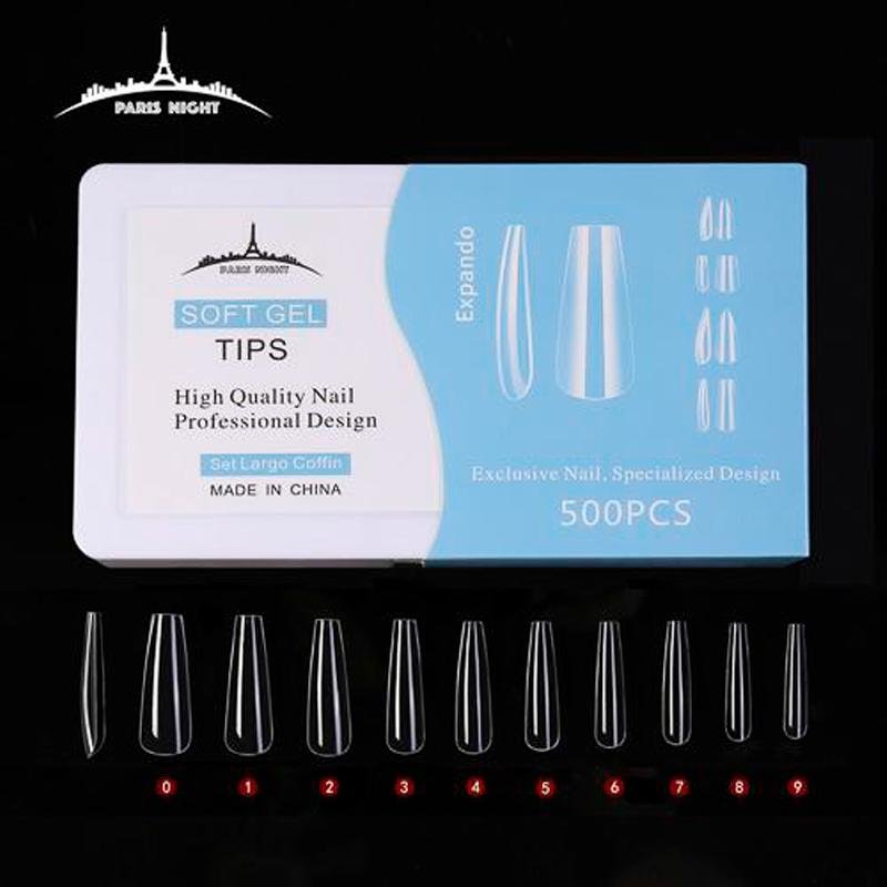 TIPS PRESS ON, SOFT GEL COFFIN TRANS LARGE x500pcs EN CAJA...
